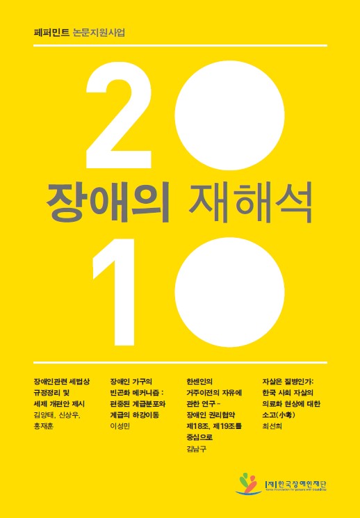 01. 장애인관련 세법상 규정정리 및 세제 개편안 제시 _김양태, 신상우, 홍재훈 02. [우수논문] 장애인가구의 빈곤화 매커니즘 : 편중된 계급분포와 계급의 하강이동 _이성민 03. 한센인의 거주이전의 자유에 관한 연구 : 장애인 권리협약 제 18조, 제 19조를 중심으로 _김남구 04. 자살은 질병인가 : 한국 사회 자상의 의료화 현상에 대한 소고(小考) _최선희