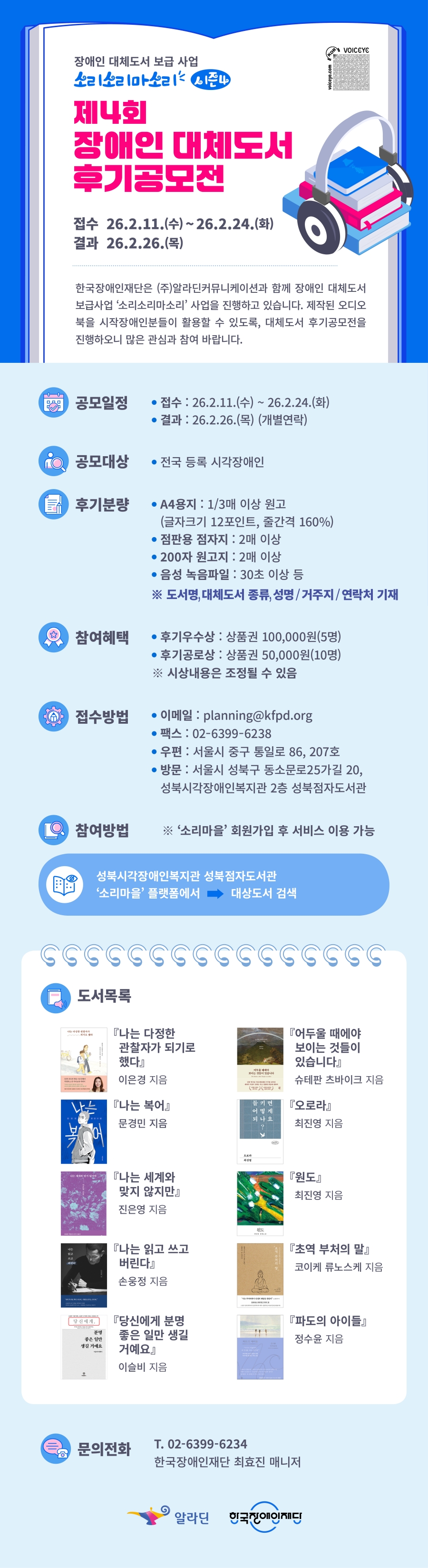 제작된 대체도서를 시각장애인분들이 활용할 수 있도록, 대체도서 후기공모전을 진행하오니 많은 관심과 참여 바랍니다.