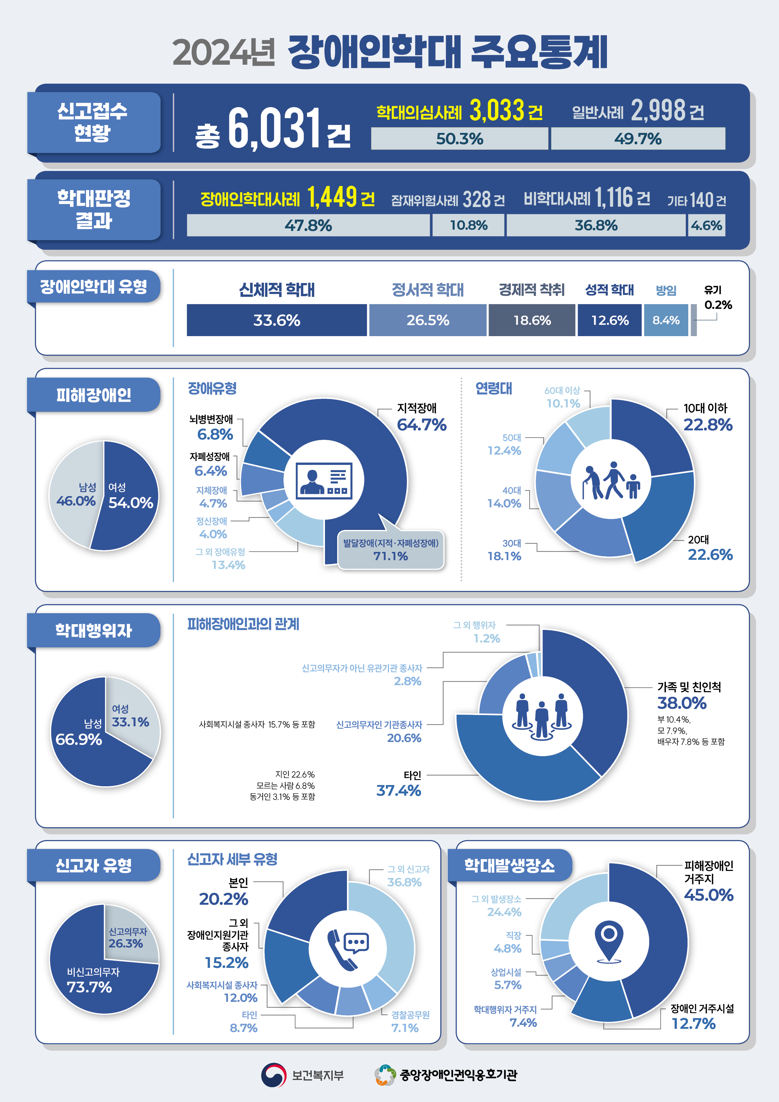 보건복지부와 중앙장애인권익옹호기관이 지난 26일 장애인학대 신고사례를 종합 분석한 '2024 장애인학대 현황보고서'를 발간했습니다. 보고서에 따르면, 장애인학대 신고 건수는 4년째 증가하고 있으며, 작년 접수된 장애인학대 신고 건수는 6031건으로 전년 대비 9.7%(534건) 증가했습니다. 이중 학대 의심사례는 3033건으로 신고 건수의 절반 가량을 차지했습니다. 이는 전년 대비 2.2%(31건) 증가한 수치입니다. 또한, 학대의심사례 중 47.8%(1449건)는 '학대' 판정을 받았으며, 전년 대비 2.2% 증가한 수준입니다(뉴시스, 2025.09.26.). 이처럼 신고 건수와 학대 의심사례, 학대 판정의 증가는 장애인학대가 여전히 심각한 사회문제임을 보여줍니다.