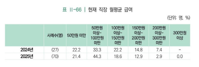 특히, 지난해 조사와 비교하면 임금 분포는 더 악화된 양상을 보였습니다. 월 50만원 이상 100만원 미만 구간의 비율이 33.3%에서 44.3%로 약 11%포인트 상승한 반면, 200만원 이상 300만원 미만 구간은 7.4%에서 2.9%로 2배 이상 감소했습니다. 이는 저임금 구간에 종사하는 장애인 노동자의 비중은 늘어난 반면, 상대적으로 높은 임금을 받는 비중은 줄어들었음을 의미합니다. 전체적으로 임금 수준이 상향 이동하기보다는, 오히려 하향 이동하는 경향이 뚜렷해진 것입니다(이데일리, 2026.02.05.).