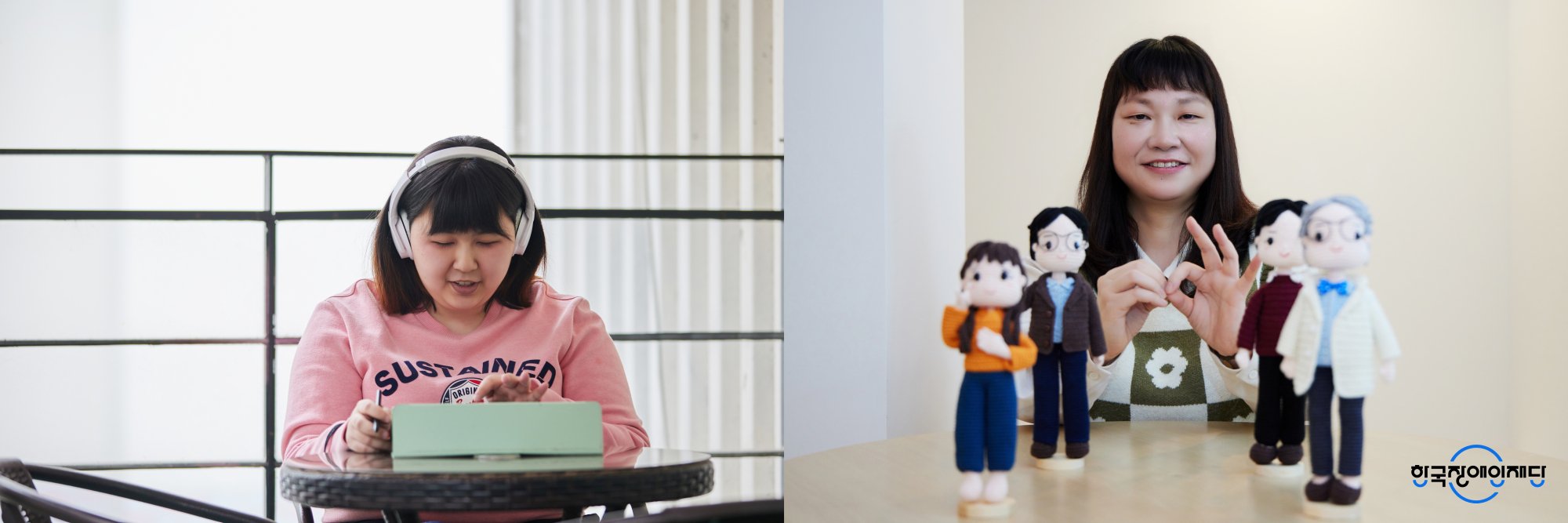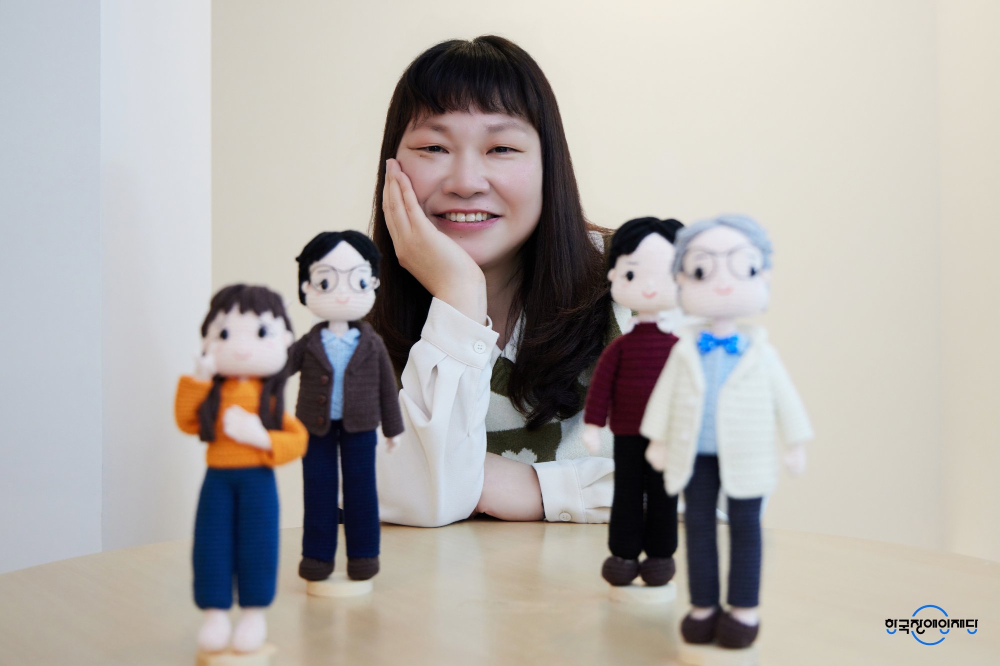 “저는 농인으로서 오랫동안 실과 바늘로 인형을 만들어왔어요. 말 대신 손으로 표현하는 제 삶을 작품에 담고 싶었습니다. 수세미 만드는 것으로 뜨개질을 시작하여, 동물도 표현해 보고 최근에는 사람을 중심으로 작업하고 있어요. 머리카락을 표현하는 게 굉장히 어려운데요. 그래도 손에 익으니까 차츰 자연스럽게 연출할 수 있게 되었습니다. 이번에 서울형 장애인 개인예산제 2차 시범사업에 참여하면서 강의도 수강하고 전시회도 열었어요. 뜨개질을 하면서 다른 작업자 분들과 교류할 수 있는 시간도 늘어나서 무척 즐겁습니다.”