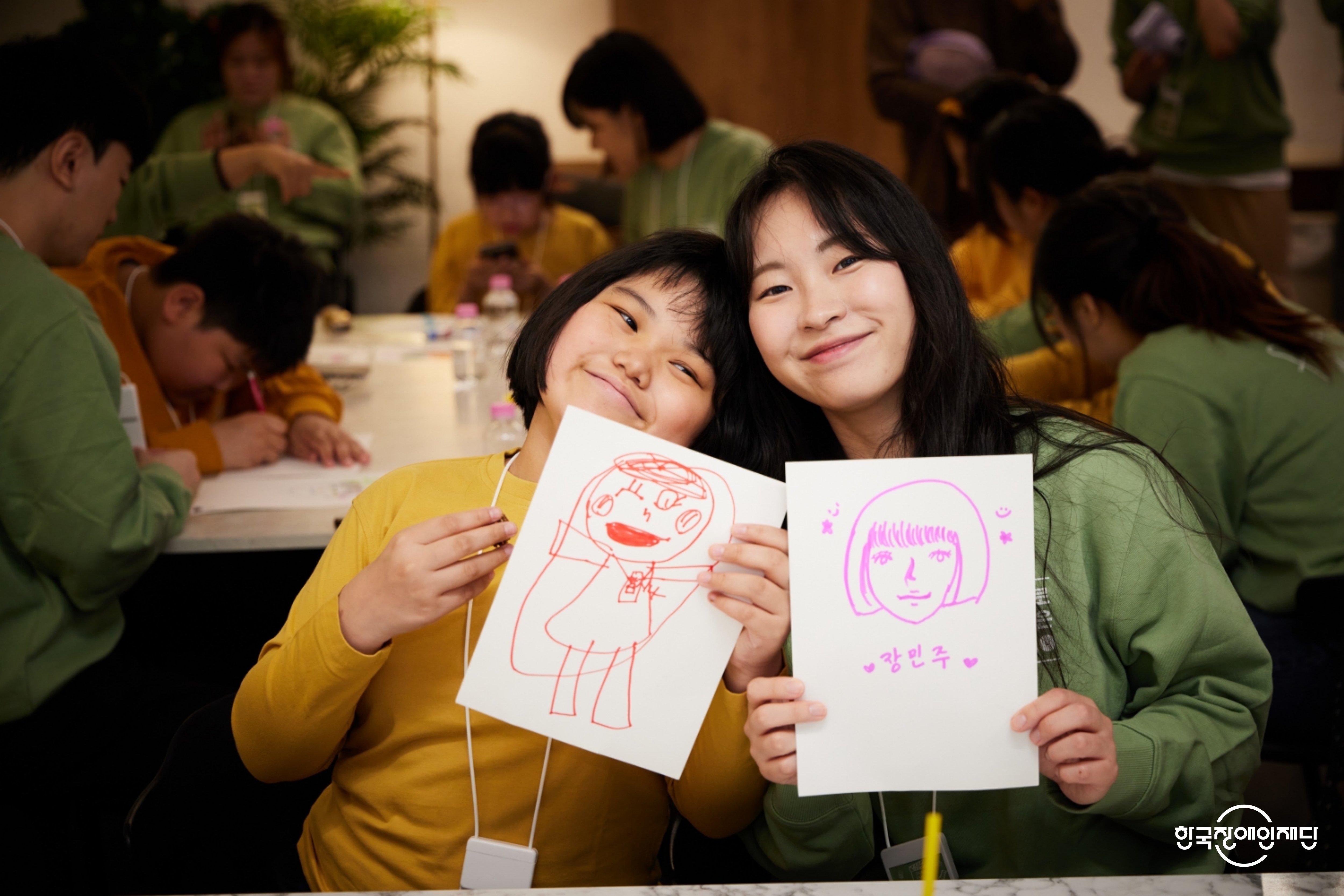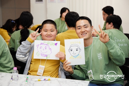 개나리처럼 노란 옷을 입은 발달장애 아동 20명과 싱그러운 나무처럼 초록색 옷을 입은 자원봉사자 20명은 영화 관람에 앞서 파티룸에 모여 인사를 나눴다. 이들은 일대일로 매칭되어 ‘짝꿍’을 이루었고, 아이스 브레이킹 활동으로 서로의 얼굴을 그려보는 시간을 가졌다. 이날이 첫 만남인 팀도 있었지만, 2년 전 놀이공원에서 이미 인연을 맺었던 짝꿍도 있었다.