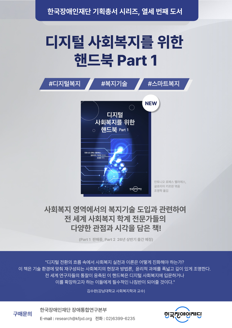 한국장애인재단에서는 번역출간사업 13번째 도서로 2023년 영국의 Routledge에서 발간한 「Routledge International Handbook of Digital Social Work」을 선정하였으며, 이에 대한 한국어판 Part 1을 출간하였습니다.