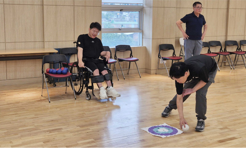 상계동 주민센터 강당은 보치아 훈련 선수로 가득합니다. 프로 선수들 사이에서 묵묵히 연습하는 김민성 학생도 보이는데요. 표적구 가까이로 공을 던지기 위해 안간힘을 씁니다.