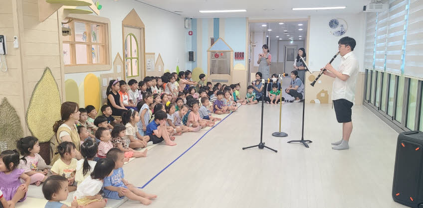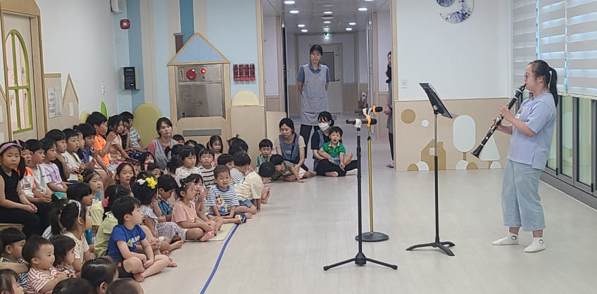 어린이집에 방문하여 각자 솔로로 클라리넷 곡을 한 곡씩 연주했고, 학생들은 굉장히 기뻐했습니다.